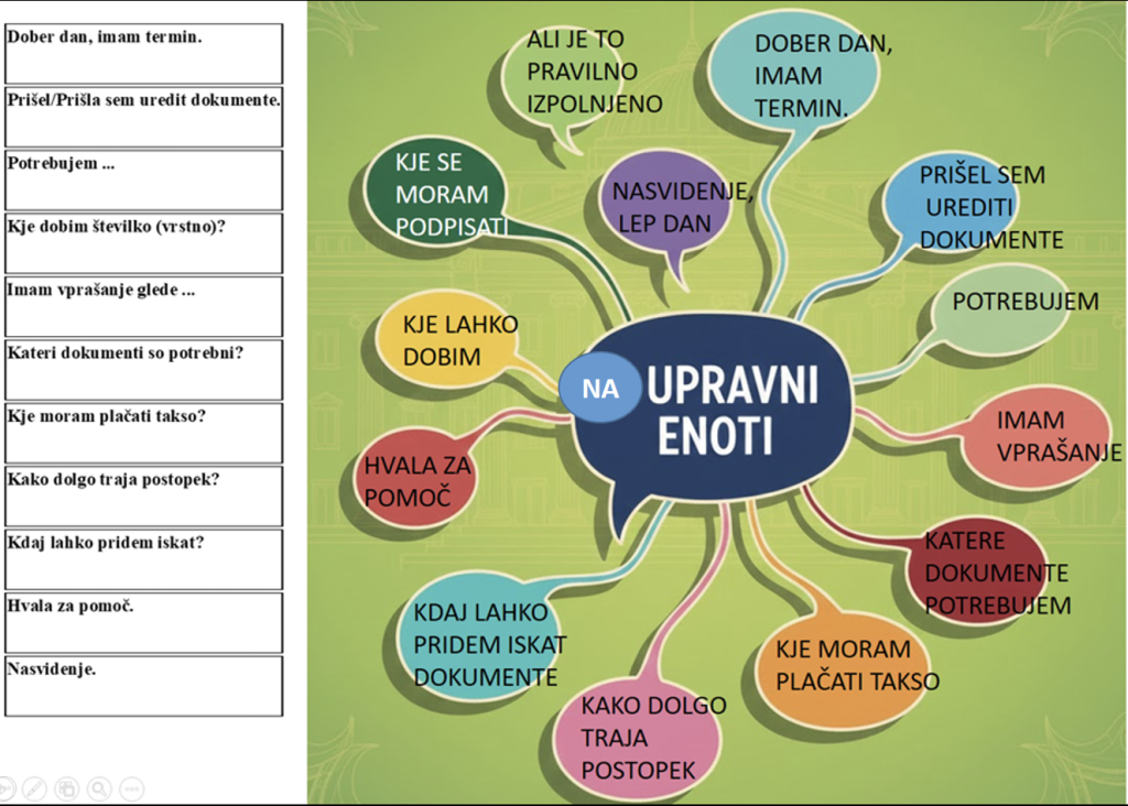 | Imam vprašanje glede … | I have a question regarding … | … glede dovoljenja za prebivanje. (regarding the residence permit.) |